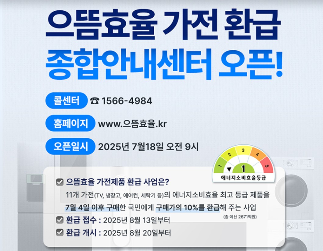 으뜸효율 가전제품 환급사업은 정말 놓치면 아까운 기회예요! 가전 교체 계획이 있으시다면 이번 기회를 꼭 활용해보세요.
